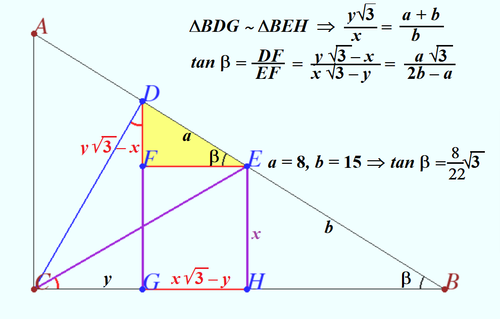 From before, we know that <math>\sin\angle B=\frac{EC}{30}\implies \sin\angle B=\frac{4\sqrt3}{13}</math>. It's now easy to compute <math>\cos\angle B</math> as well using the Pythagorean identity; we find that <math>\cos\angle B=\frac{11}{13}</math>, and thus <math>\tan\angle B=\frac{4\sqrt3}{11}</math> for an answer of <math>\boxed{018}</math>. | From before, we know that <math>\sin\angle B=\frac{EC}{30}\implies \sin\angle B=\frac{4\sqrt3}{13}</math>. It's now easy to compute <math>\cos\angle B</math> as well using the Pythagorean identity; we find that <math>\cos\angle B=\frac{11}{13}</math>, and thus <math>\tan\angle B=\frac{4\sqrt3}{11}</math> for an answer of <math>\boxed{018}</math>. | ||