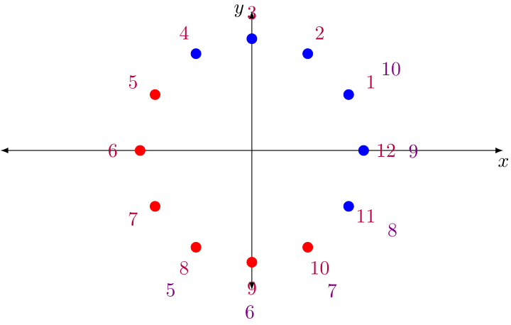 So, translate all the red dots by <math>90^{\circ}</math> and sum the cosines of angles of the blue and (rotated) red dots. | |||