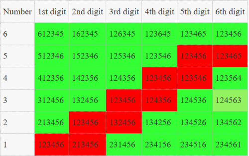 We start with five cards in ascending order, then insert the sixth card to obtain a valid arrangement. | |||