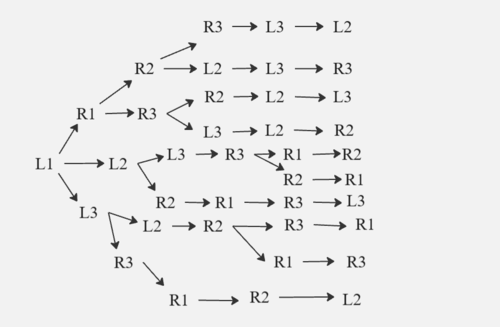 Notice how we can interchange the first shoe with any \( L_1 \), \( L_2 \), \( L_3 \), \( R_1 \), \( R_2 \), \( R_3 \), and still get the same tree, but just interchanged shoes. Therefore, we just multiply the tree's branches by 6, to get \( 6 \cdot 10 = \)