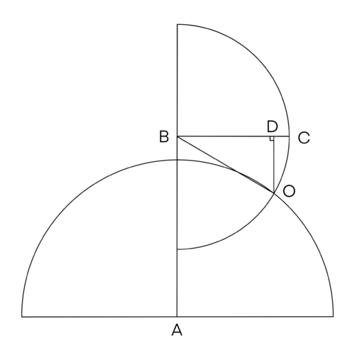 Note that the possible points of <math>C</math> create a semi-circle of radius <math>5</math> and center <math>B</math>. The area where <math>AC < 7</math> is enclosed by a circle of radius <math>7</math> and center <math>A</math>. The probability that <math>AC < 7</math> is <math>\frac{\angle ABO}{180 ^\circ}</math>. | |||