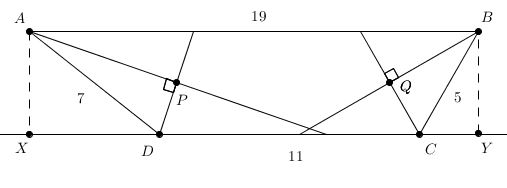 Drop perpendiculars to <math>CD</math> from <math>A</math> and <math>B</math>, and call the intersections <math>X,Y</math> respectively. Now, <math>DA^2-BC^2=(7-5)(7+5)=DX^2-CY^2</math> and <math>DX+CY=19-11=8</math>. Thus, <math>DX-CY=3</math>. | Drop perpendiculars to <math>CD</math> from <math>A</math> and <math>B</math>, and call the intersections <math>X,Y</math> respectively. Now, <math>DA^2-BC^2=(7-5)(7+5)=DX^2-CY^2</math> and <math>DX+CY=19-11=8</math>. Thus, <math>DX-CY=3</math>. | ||