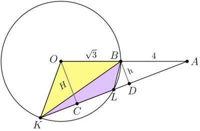 <math>KL</math> is the base of triangles <math>\triangle OKL</math> and <math>\triangle BKL \implies \frac {[BKL]}{[OKL]} = \frac{h}{H} =</math> const <math>\implies</math> | |||