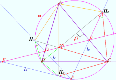 Similarly we get <math>F \in BC, \frac {\vec {BF}}{\vec {FC}} = \frac {\tan \gamma – \tan \alpha}{ \tan \beta –\tan \alpha} > 0.</math> | |||