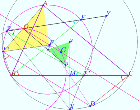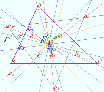 Point <math>F</math> lyes on ray <math>BC, \frac {\vec {BF}}{\vec {CF}} = \frac {\tan \alpha – \tan \gamma}{\tan \beta – \tan \alpha} > 0.</math> | |||