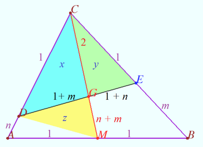 Denote <math>n = \frac {\vec BD}{\vec DA}, m = \frac {\vec CE}{\vec EA}, p = \frac {\vec CX}{\vec XB}, X \in BC, q = \frac {AY}{YX}, Y \in AX.</math> | |||