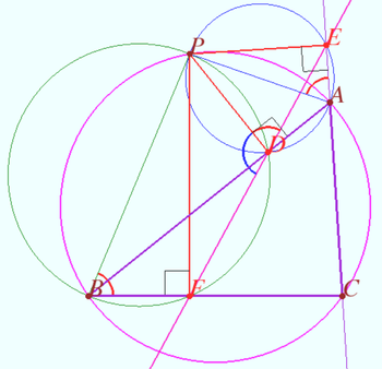 Let a triangle <math>\triangle ABC</math> and a point <math>P</math> be given. Let <math>D, E,</math> and <math>F</math> be the foots of the perpendiculars dropped from P to lines AB, AC, and BC, respectively. | |||
