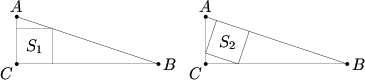 Squares <math>S_1</math> and <math>S_2</math> are inscribed in right triangle <math>ABC</math>, as shown in the figures below. Find <math>AC + CB</math> if area <math>(S_1) = 441</math> and area <math>(S_2) = 440</math>. | |||