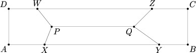 Rectangle <math>ABCD</math> is divided into four parts of equal area by five segments as shown in the figure, where <math>XY = YB + BC + CZ = ZW = WD + DA + AX</math>, and <math>PQ</math> is parallel to <math>AB</math>. Find the length of <math>AB</math> (in cm) if <math>BC = 19</math> cm and <math>PQ = 87</math> cm. | |||