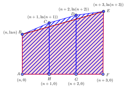 Let the coordinates of the quadrilateral be <math>(n,\ln(n)),(n+1,\ln(n+1)),(n+2,\ln(n+2)),(n+3,\ln(n+3))</math>. We have by shoelace's theorem, that the area is<cmath>\frac{\ln(n)(n+1) + \ln(n+1)(n+2) + \ln(n+2)(n+3)+n\ln(n+3)}{2} - \frac{\ln(n+1) | Let the coordinates of the quadrilateral be <math>(n,\ln(n)),(n+1,\ln(n+1)),(n+2,\ln(n+2)),(n+3,\ln(n+3))</math>. We have by shoelace's theorem, that the area is<cmath>\frac{\ln(n)(n+1) + \ln(n+1)(n+2) + \ln(n+2)(n+3)+n\ln(n+3)}{2} - \frac{\ln(n+1)(n) + \ln(n+2)(n+1) + \ln(n+3)(n+2)+\ln(n)(n+3)}{2}=</cmath><cmath>\frac{\ln \left( \frac{n^{n+1}(n+1)^{n+2}(n+2)^{n+3}(n+3)^n}{(n+1)^n(n+2)^{n+1}(n+3)^{n+2}n^{n+3}}\right)}{2} = \ln \left( \sqrt{\frac{(n+1)^2(n+2)^2}{n^2(n+3)^2}} \right) = \ln \left(\frac{(n+1)(n+2)}{n(n+3)}\right) = \ln \left( \frac{91}{90} \right).</cmath>We now that the numerator must have a factor of <math>13</math>, so given the answer choices, <math>n</math> is either <math>12</math> or <math>11</math>. If <math>n=11</math>, the expression <math>\frac{(n+1)(n+2)}{n(n+3)}</math> does not evaluate to <math>\frac{91}{90}</math>, but if <math>n=12</math>, the expression evaluates to <math>\frac{91}{90}</math>. Hence, our answer is <math>\boxed{12}</math>. | ||