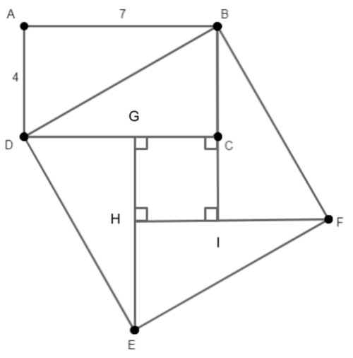 Rectangle <math>ABCD</math> is drawn such that <math>AB=7</math> and <math>BC=4</math>. <math>BDEF</math> is a square that contains vertex <math>C</math> in its interior. Find <math>CE^2+CF^2</math>. | Rectangle <math>ABCD</math> is drawn such that <math>AB=7</math> and <math>BC=4</math>. <math>BDEF</math> is a square that contains vertex <math>C</math> in its interior. Find <math>CE^2+CF^2</math>. | ||