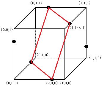 ) from each other. The same is true for the three dots that are near (1,1,1). There is a unique x for which the rectangle drawn in red becomes a square. This will occur when the distance from (x,0,0) to (1,1-x, 1) is (x)(