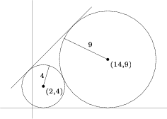 [[Circle]]s with [[center]]s <math>(2,4)</math> and <math>(14,9)</math> have [[radius | radii]] <math>4</math> and <math>9</math>, respectively. The equation of a common external [[tangent line|tangent]] to the circles can be written in the form <math>y=mx+b</math> with <math>m>0</math>. What is <math>b</math>? | [[Circle]]s with [[center_(geometry) | center]]s <math>(2,4)</math> and <math>(14,9)</math> have [[radius | radii]] <math>4</math> and <math>9</math>, respectively. The equation of a common external [[tangent line|tangent]] to the circles can be written in the form <math>y=mx+b</math> with <math>m>0</math>. What is <math>b</math>? | ||
