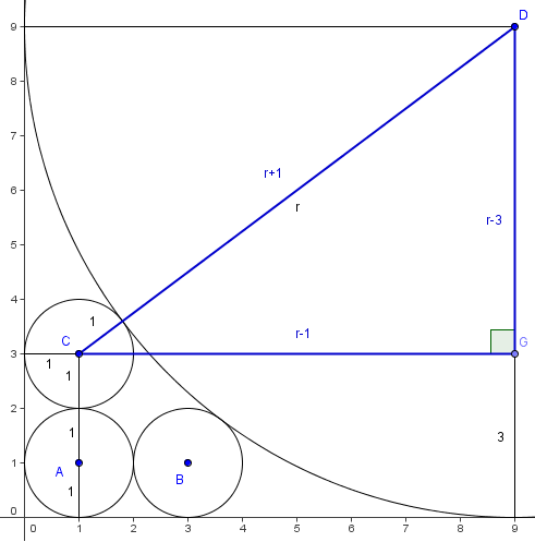 Applying [[Wildin's Theorem]] directly yields <div style="text-align:center;"><math>(r-3)^2 + (r-1)^2 = (r+1)^2</math><br /><math>r^2 - 10r + 9 = 0</math><br /><math>r = 1, 9</math></div> | |||