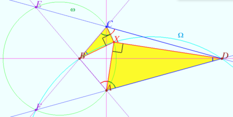<i><b>Claim 1</b></i> Let <math>A, C,</math> and <math>E</math> be arbitrary points on a circle <math>\omega, l</math> be the perpendicular bisector to the segment <math>AC.</math> Then the straight lines <math>AE</math> and <math>CE</math> intersect <math>l</math> at the points <math>B</math> and <math>D,</math> symmetric with respect to <math>\omega.</math> | <i><b>Claim 1</b></i> Let <math>A, C,</math> and <math>E</math> be arbitrary points on a circle <math>\omega, l</math> be the perpendicular bisector to the segment <math>AC.</math> Then the straight lines <math>AE</math> and <math>CE</math> intersect <math>l</math> at the points <math>B</math> and <math>D,</math> symmetric with respect to <math>\omega.</math> | ||