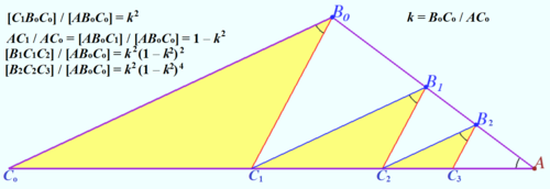 Similarly the coefficient of the similarity of triangles <math>\triangle AB_2C_2 \sim \triangle AB_0C_0</math> is <math> (1 – k^2)^2 \implies \frac {[B_2C_2C_3]}{[AB_0C_0 ]} = k^2 (1 – k^2)^4 </math> and so on. | |||