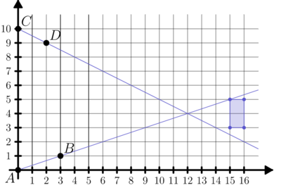 If the analytic expression for line <math> AB </math> is <math> y=k_{1}x | Note that the <math> y </math>-intercept of line <math> AB </math> and line <math> CD </math> are <math> 0 </math> and <math> 10 </math>. If the analytic expression for line <math> AB </math> is <math> y=k_{1}x </math>, and the analytic expression for line <math> CD </math> is <math> y=k_{2}x+10 </math>, we have equations:<math> 3k_{1} = 1 </math> and <math> 2k_{2} + 10 = 9 </math>. Solving these equations, we can find out that <math> k_{1} = \frac{1}{3} </math> and <math> k_{2} = -\frac{1}{2} </math>. Therefore, we can determine that the expression for line <math> AB </math> is <math> y=\frac{1}{3}x </math>. and the expression for line <math> CD </math> is <math> y=-\frac{1}{2}x + 10 </math>. When <math> x=15 </math>, the coordinates that line <math> AB </math> and line <math> CD </math> pass through are <math> (15, 5) </math> and <math> \left(15, \frac{5}{2}\right) </math>, and <math> (15, 5) </math> lies perfectly on one vertex of the rectangle while the <math> y </math> coordinate of <math> \left(15, \frac{5}{2}\right) </math> is out of the range <math> 3 \leq y \leq 5 </math> (lower than the bottom left corner of the rectangle <math> (15, 3) </math>). Considering that the <math> y </math> value of the line <math> CD </math> will only decrease, and the <math> y </math> value of the line <math> AB </math> will only increase, there will not be another point on the rectangle that lies on either of the two lines. Thus, we can conclude that the answer is <math>\boxed{\textbf{(B)}\ 1}</math> | ||