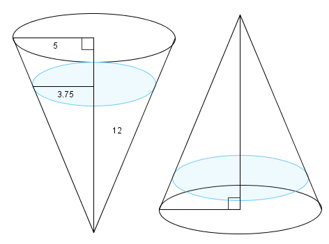 inches deep when the cone is held with its point down and its base horizontal. When the liquid is held with its point up and its base horizontal, the height of the liquid is