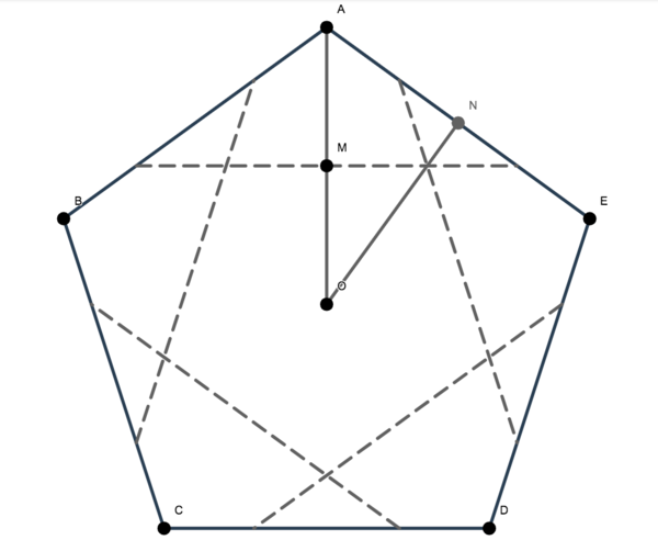<math>(\frac{OM}{ON})^{2} = (\frac{\frac{OA}{2}}{OA\sin (\angle OAE)})^{2} = \frac{1}{4\sin^{2}54}</math> | <math>\left(\frac{OM}{ON}\right)^{2} = \left(\frac{\frac{OA}{2}}{OA\sin (\angle OAE)}\right)^{2} = \frac{1}{4\sin^{2}54}</math> | ||