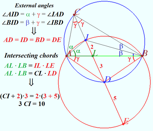 As <math>\angle BCD</math> and <math>\angle BAD</math> intercept the same arc, we know that <math>\angle BAD=\gamma</math>. Similarly, <math>\angle ABD=\gamma</math>. Also, using <math>\triangle ICA</math>, we find <math>\angle CIA=180-\alpha-\gamma</math>. Therefore, <math>\angle AID=\alpha+\gamma=\angle DAI, so < | As <math>\angle BCD</math> and <math>\angle BAD</math> intercept the same arc, we know that <math>\angle BAD=\gamma</math>. Similarly, <math>\angle ABD=\gamma</math>. Also, using <math>\triangle ICA</math>, we find <math>\angle CIA=180-\alpha-\gamma</math>. Therefore, <math>\angle AID=\alpha+\gamma=\angle DAI</math>, so <math>\triangle AID</math> must be isosceles with <math>AD=ID=5</math>. Similarly, <math>BD=ID=5</math>. Then <math>\triangle DLB \sim \triangle ALC</math>, hence <math>\frac{AL}{AC} = \frac{3}{5}</math>. Also, <math>AI</math> bisects <math>\angle LAC</math>, so by the Angle Bisector Theorem <math>\frac{CI}{IL} =\frac{AC}{AL}= \frac{5}{3}</math>. Thus <math>CI = \frac{10}{3}</math>, and the answer is <math>\boxed{013}</math>. | ||