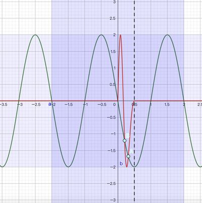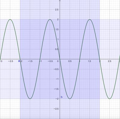 We first create the graph of <math>f(x)</math> by transforming a regular <math>sin</math> graph by scaling down <math>x</math> by <math>\pi</math> and scaling up <math>y</math> by <math>-2</math>. | We first create the graph of <math>f(x)</math> by transforming a regular <math>sin</math> graph by scaling down <math>x</math> by <math>\pi</math> and scaling up <math>y</math> by <math>-2</math>. | ||