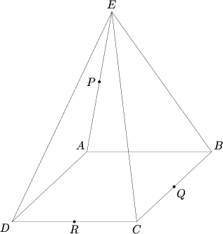 Use 3D analytical geometry, setting the origin as the center of the square base and the pyramid’s points oriented as shown above.