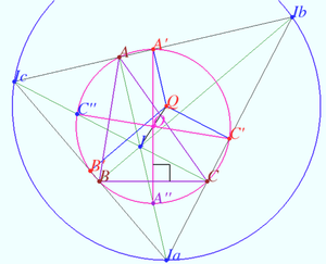 The Bevan point, named after Benjamin Bevan, is a center of the Bevan circle, that is the circle through the centers of the three excircles of a triangle. | The Bevan point, named after Benjamin Bevan, is a center of the Bevan circle, that is the circle through the centers of the three excircles of a triangle. | ||