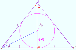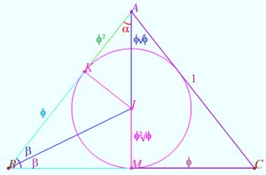 <math>\triangle BDQ \sim \triangle BQA \implies \frac {BD}{BQ} = \frac {BQ}{AB} = \frac {BQ}{BD + BQ} \implies \triangle ABC</math> is the aureate triangle. | <math>\triangle BDQ \sim \triangle BQA \implies \frac {BD}{BQ} = \frac {BQ}{AB} = \frac {BQ}{BD + BQ} \implies \triangle ABC</math> is the aureate triangle. | ||