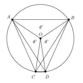 Note that a cyclic quadrilateral in the form of an isosceles trapezoid can be formed from three chords of three <math>d</math>-degree arcs and one chord of one <math>3d</math>-degree arc. The diagonals of this trapezoid turn out to be two chords of two <math>2d</math>-degree arcs. Let <math>AB</math>, <math>AC</math>, and <math> | Note that a cyclic quadrilateral in the form of an isosceles trapezoid can be formed from three chords of three <math>d</math>-degree arcs and one chord of one <math>3d</math>-degree arc. The diagonals of this trapezoid turn out to be two chords of two <math>2d</math>-degree arcs. Let <math>AB</math>, <math>AC</math>, and <math>BD</math> be the chords of the <math>d</math>-degree arcs, and let <math>CD</math> be the chord of the <math>3d</math>-degree arc. Also let <math>x</math> be equal to the chord length of the <math>3d</math>-degree arc. Hence, the length of the chords, <math>AD</math> and <math>BC</math>, of the <math>2d</math>-degree arcs can be represented as <math>x + 20</math>, as given in the problem. | ||