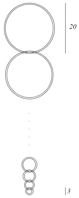 A number of linked rings, each 1 cm thick, are hanging on a peg. The top ring has an outside diameter of 20 cm. The outside diameter of each of the outer rings is 1 cm less than that of the ring above it. The bottom ring has an outside diameter of 3 cm. What is the distance, in cm, from the top of the top ring to the bottom of the bottom ring?