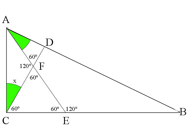 \angle BAC &= \angle EAC + \angle BAE = 60^\circ - x + x = 60^\circ\end{align*}</cmath> | \angle BAC &= \angle EAC + \angle BAE = 60^\circ - x + x = 60^\circ\end{align*}</cmath> | ||