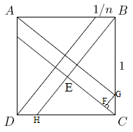 \frac{BE}{1}=\frac{EC}{\frac{n-1}{n}}\implies | \frac{BE}{1}=\frac{EC}{\frac{n-1}{n}}\implies | ||
