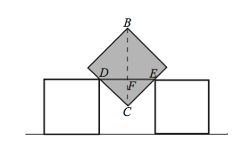 Consider the rotated middle square shown in the figure. It will drop until length <math>DE</math> is 1 inch. Then, because <math>DEC</math> is a <math>45^{\circ}-45^{\circ}-90^{\circ}</math> triangle, <math>EC=\frac{\sqrt{2}}{2}</math>, and <math>FC=\frac{1}{2}</math>. We know that <math>BC=\sqrt{2}</math>, so the distance from <math>B</math> to the line is | Consider the rotated middle square shown in the figure. It will drop until length <math>DE</math> is 1 inch. Then, because <math>DEC</math> is a <math>45^{\circ}-45^{\circ}-90^{\circ}</math> triangle, <math>EC=\frac{\sqrt{2}}{2}</math>, and <math>FC=\frac{1}{2}</math>. We know that <math>BC=\sqrt{2}</math>, so the distance from <math>B</math> to the line is | ||