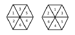 A hexagon is divided into 6 equilateral triangles. How many ways can we put the numbers from 1 to 6 in each triangle, without repetition, such that the sum of the numbers of three adjacent triangles is always a multiple of 3? Solutions obtained by rotation or reflection are differents, thus the following figures represent two distinct solutions.