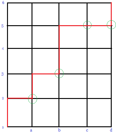 The red path corresponds to the sequence of rolls <math>2, 3, 5, 5</math>. This establishes a one-to-one correspondence between valid dice roll sequences and block walking paths. | The red path corresponds to the sequence of rolls <math>2, 3, 5, 5</math>. This establishes a one-to-one correspondence between valid dice roll sequences and block walking paths. | ||