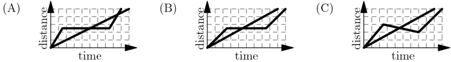 A tortoise challenges a hare to a race. The hare eagerly agrees and quickly runs ahead, leaving the slow-moving tortoise behind. Confident that he will win, the hare stops to take a nap. Meanwhile, the tortoise walks at a slow steady pace for the entire race. The hare awakes and runs to the finish line, only to find the tortoise already there. Which of the following graphs matches the description of the race, showing the distance