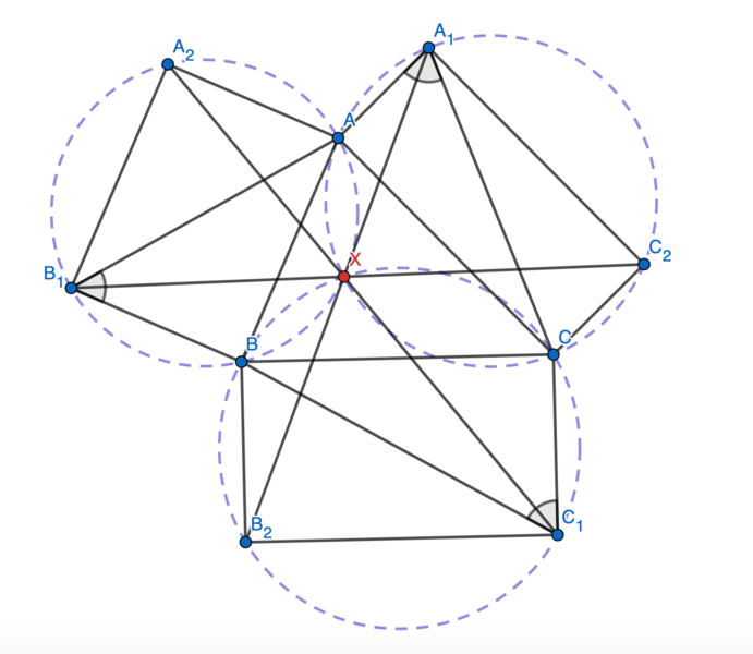 Now we show that $K$ is the intersection of $B_1C_2,$ $C_1A_2,$ and $A_1B_2.$ Note that $\angle C_1XB = \angle BXA_2 = 90^\circ,$ so $A_2, K, C_1$ are collinear. Similarly, $B_1, K, C_2$ and $A_1, K, B_2$ are collinear, so the three lines concur and we are done.