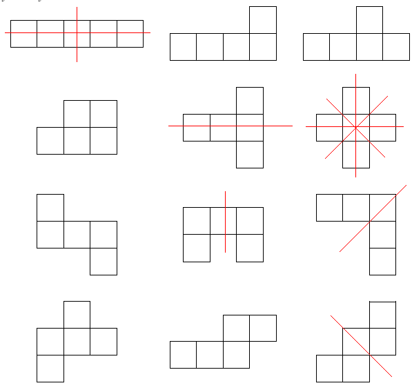 How many of the twelve pentominoes pictured below have at least one line of symmetry?