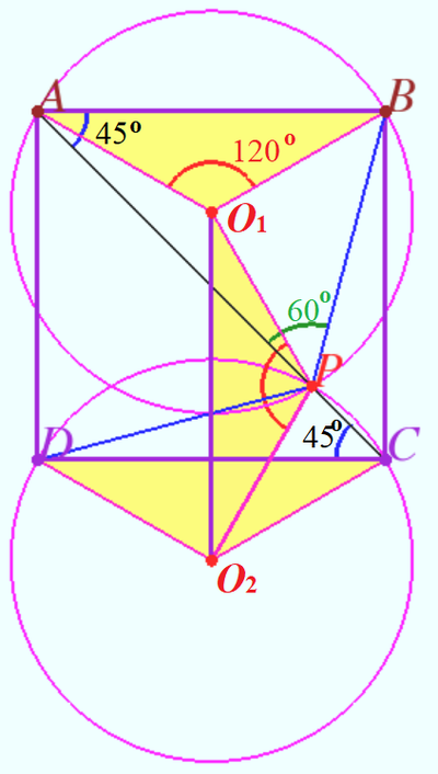 Because the interior angles of a triangle add to 180 degrees, angle ABP has measure 75 degrees and angle PDC has measure 15 degrees. Subtracting, it is found that both angles