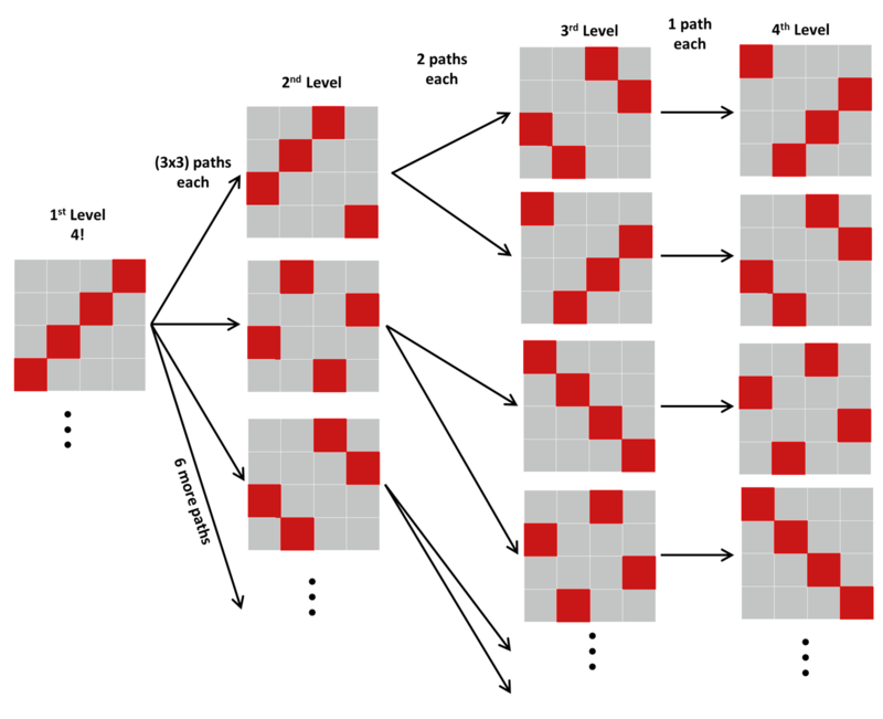 Starting with the first level configuration as shown above, this configuration has three possible paths to the next level square grid to squares where the red square of the first column is the the one in the 3rd row as shown. Not shown in the image this configuration will have three more possible paths to squares where the red square of the first column is the the one in the 2nd row, and three red square of the first column is the the one in the 2nd row. That is a total of 9 paths.