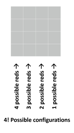 In order to have exactly one red in each column and exactly one red in each row of the 4x4 grid, one can select any square red in the first column, for the second column we can only chose from 3 to paint red, the third column we can only chose 2 and the last one we can only chose 1.