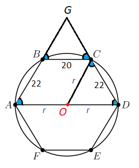 As we can see this image, it is symmetrical hence the diameter divides the hexagon into two congruent quadrilateral. Now we can apply the Ptolemy's theorem. Denote the radius is r, we can get