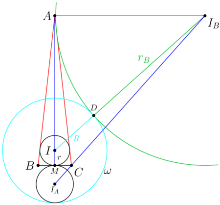 (because of tangency) is equal to the sum of diameter of the excircle with center
