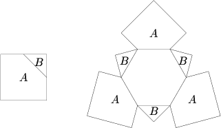 , as shown in the first figure below, by joining the midpoints of two adjacent sides. These six pieces are then attached to a regular hexagon, as shown in the second figure, so as to fold into a polyhedron. What is the volume (in