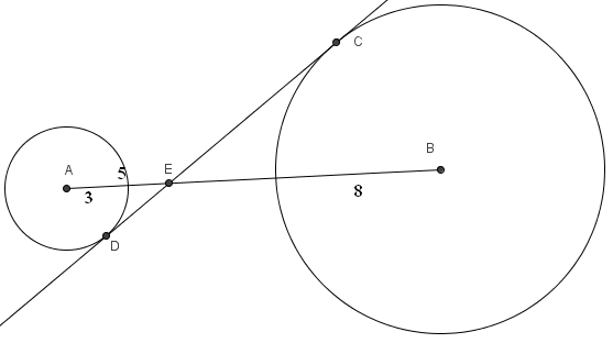 , respectively. A common internal tangent intersects the circles at