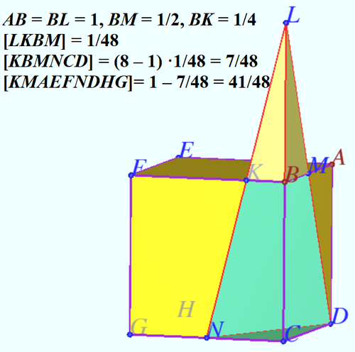 - Another way to finish after using coordinates: Take the volume of DMBCNQ as the sum of the volumes of DMBQ and DBCNQ. Then, we have the sum of the volumes of a tetrahedron and a pyramid with a trapezoidal base. Their volumes, respectively, are