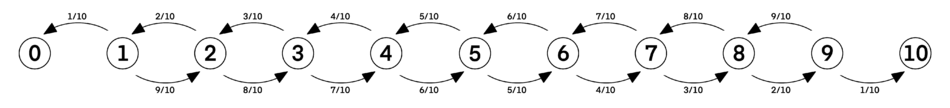 Notice that the probabilities are symmetrical around the fifth lily pad. If the frog is on the fifth lily pad, there is a