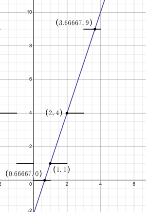 We quickly see that \( \lfloor x \rfloor^2 = 3x - 2 \). We need the solutions that fulfill \( \lfloor x \rfloor^2 \) and \( 3x - 2 \). We quickly draw the system of equations.