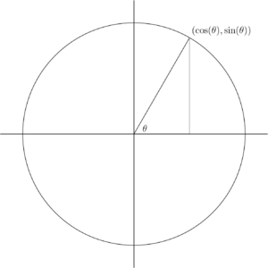 Consider the unit circle, the circle with radius one centered at the origin. Starting at $(1, 0)$, walk a distance $\theta$ counterclockwise around the unit circle, as shown in the diagram. The coordinates of this point are defined to be $(\cos (\theta), \sin (\theta) )$.